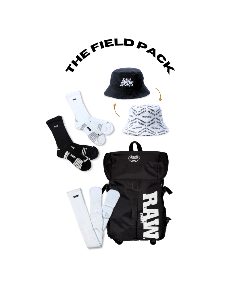 The Reversible Bucket Hat: Switch between the “Blackout” logo look and the iconic RAW Sports pattern to match your kit.